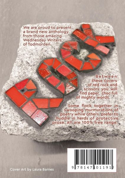 This is the unlucky 13th anthology from the Wednesday Writers of Todmorden. Between these covers of red rock and scissors you will find paper, choc-full of mighty words. Some flock together in swooping murmurations of poetry while others prefer to huddle in herds of protective prose. All are 100% free range and hand-reared over the last 12-months for your delectation.
