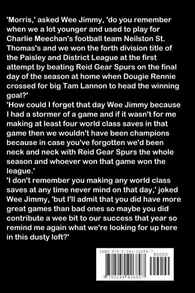 'Morris,' asked Wee Jimmy, 'do you remember when we a lot younger and used to play for Charlie Meechan's football team Neilston St. Thomas's and we won the forth division title of the Paisley and District League at the first attempt by beating Reid Gear Spurs on the final day of the season at home when Dougie Rennie crossed for big Tam Lannon to head the winning goal?' 'How could I forget that day Wee Jimmy because I had a stormer of a game and if it wasn't for me making at least four world class saves in that game then we wouldn't have been champions because in case you've forgotten we'd been neck and neck with Reid Gear Spurs the whole season and whoever won that game won the league.' 'I don't remember you making any world class saves at any time never mind on that day,' joked Wee Jimmy, 'but I'll admit that you did have more great games than bad ones so maybe you did contribute a wee bit to our success that year so remind me again what we're looking for up here in this dusty loft?'