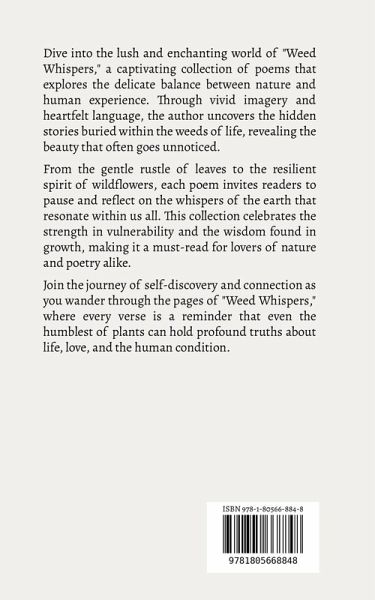 Dive into the lush and enchanting world of "Weed Whispers," a captivating collection of poems that explores the delicate balance between nature and human experience. Through vivid imagery and heartfelt language, the author uncovers the hidden stories buried within the weeds of life, revealing the beauty that often goes unnoticed. From the gentle rustle of leaves to the resilient spirit of wildflowers, each poem invites readers to pause and reflect on the whispers of the earth that resonate within us all. This collection celebrates the strength in vulnerability and the wisdom found in growth, making it a must-read for lovers of nature and poetry alike. Join the journey of self-discovery and connection as you wander through the pages of "Weed Whispers," where every verse is a reminder that even the humblest of plants can hold profound truths about life, love, and the human condition.