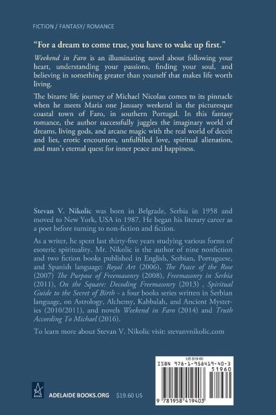 Weekend in Faro is an illuminating novel about following your heart, understanding your passions, finding your soul, and believing in something greater than yourself that makes life worth living. The bizarre life journey of Michael Nicolau comes to its pinnacle when he meets Maria one January weekend in the picturesque coastal town of Faro, in southern Portugal. In this fantasy romance, the author successfully juggles the imaginary world of dreams, living gods, and arcane magic with the real world of deceit and lies, erotic encounters, unfulfilled love, spiritual alienation, and man's eternal quest for inner peace and happiness.
