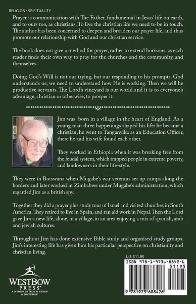 Prayer is communication with The Father, fundamental in Jesus' life on earth, and to ours too, as christians. To live the christian life we need to be in touch. The author has been concerned to deepen and broaden our prayer life, and thus promote our relationship with God and our christian service. The book does not give a method for prayer, rather to extend horizons, as each reader finds their own way to pray for the churches and the community, and themselves. Doing God's Will is not our trying, but our responding to his prompts. God understands us; we need to understand how He is working. Then we will be productive servants. The Lord's vineyard is our world and it is to everyone's advantage, christian or otherwise, to prosper it.