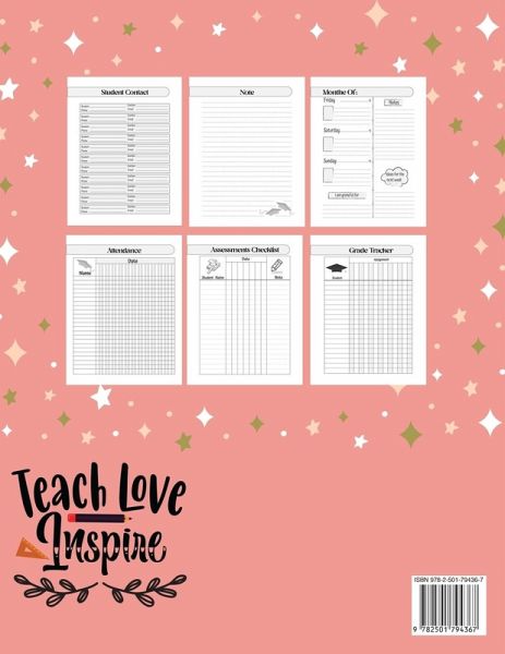 Designed for teachers by teachers! Undated pages measure 8.5" (w) x 11" (h) with plenty of room for weekly lesson plans. This planner works great for teachers and even home-school parents! Allowing it to lay flat on your desk to view your entire week. The monthly spreads boast a large calendar grid overview on one page, with space to write in the month and coordinating lined notes page. Expansive, weekly planning pages allow for period segments for each instructional day, a dedicated week space. Smaller weekend day segments also included on each weekly spread. Additional features include semester overviews, birthday lists and, class lists, and a 365-holiday list, all bundled inside the durable, texture cover material. This teacher planner is perfect for weekly lesson plans