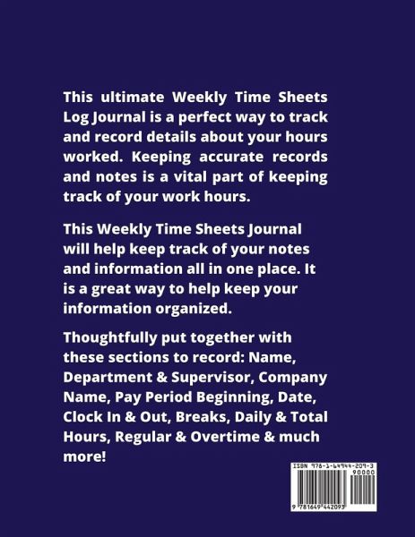 This Weekly Time Sheets Log Book is a perfect way for working people to keep track of their total personal hours worked information. Time Sheet keeper will help you monitor 198 weeks, 2 weeks per page. Each page includes space to fill in: Employee Name, Address & ID Number Department & Supervisor Company Name, Phone Number, & Address Pay Period Beginning Date & Day Of The Week Clock In Break 1 & 2 Lunch Clock Out Daily Hours Total Hours, Regular & Overtime Pay Rate, Regular & Overtime Total Pay, Regular & Overtime Date Of Payment Gross Pay The perfect notebook for an employer to record and monitor employee working hours or for personal use to keep track of time spent. If you need to track your work hours, this is great for a small added assurance, etc. Simple and easy to use and look back on. Journals and notebooks are great to keep all your important information all in one place. Finished product size is 8.5x11 inches, 102 pages, soft matte finish cover, quality white paper, black ink. paperback.
