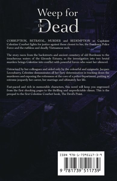 Corruption; Betrayal; Murder; Redemption; as Capitaine Celestine Courbet fights for justice against those closest to her, the Bordeaux Police Force and the ruthless and deadly Vietnamese mob. The story races from the backstreets and ancient cemetery of old Bordeaux to the treacherous waters of the Gironde Estuary, as the investigation into two brutal murders brings Celestine into conflict with powerful forces who want her silenced. Ostracised by her colleagues and aided only by the colourful and enigmatic Jacques Lecoubarry, Celestine demonstrates all her fiery determination in tracking down the murderers and exposing the rottenness at the core of a police department, putting in extreme jeopardy her career, her marriage and ultimately her life. Fast-paced and rich in memorable characters, this novel will keep you engrossed from the first shocking pages to the thrilling and unpredictable climax.