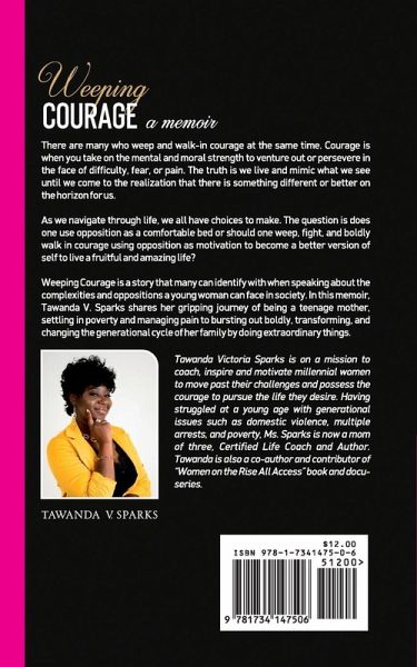 There are many who weep and walk in courage at the same time. Courage is when you take on the mental and moral strength to venture out or persevere in the face of difficulty, fear, or pain. The truth is we live and mimic what we see until we come to the realization that there is something different or better on the horizon for us.As we navigate through life, we all have choices to make. The question is does one use opposition as a comfortable bed or should one weep, fight, and boldly walk in courage using opposition as motivation to become a better version of self to live a fruitful and amazing life? Weeping Courage is a story that many can identify with when speaking about the complexities and oppositions a young woman can face in society. In this memoir, Tawanda Sparks shares her gripping journey of being a teenage mother, settling in poverty and managing pain to bursting out boldly, transforming, and changing the generational cycle of her family by doing extraordinary things.