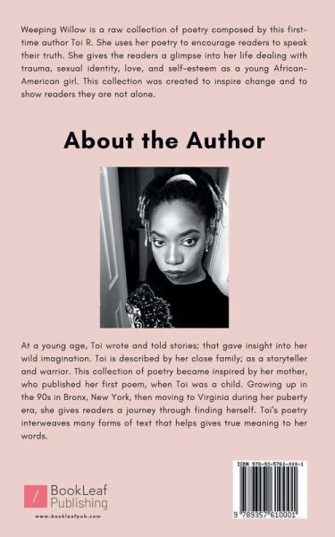 Weeping Willow is a raw collection of poetry composed by this first-time author Toi R. She uses her poetry to encourage readers to speak their truth. She gives the readers a glimpse into her life dealing with trauma, sexual identity, love, and self-esteem as a young African-American young girl. This collection was created to inspire change and to show readers they are not alone.