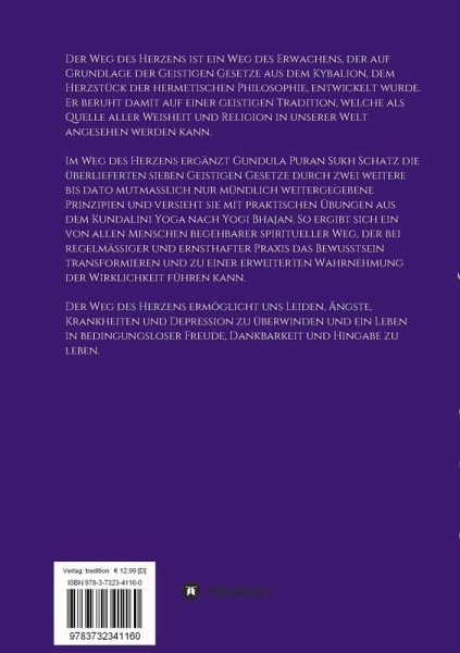 Im Weg des Herzens ergänzt Gundula Puran Sukh Schatz die überlieferten sieben Geistigen Gesetze durch zwei weitere bis dato mutmaßlich nur mündlich weitergegebene Prinzipien und versieht sie mit praktischen Übungen aus dem Kundalini Yoga nach Yogi Bhajan. So ergibt sich ein von allen Menschen begehbarer spiritueller Weg, der bei regelmässiger und ernsthafter Praxis das Bewusstsein transformieren und zu einer erweiterten Wahrnehmung der Wirklichkeit führen kann.