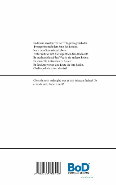 In diesem zweiten Teil seiner Trilogie fragt sich der Protagonist nach dem Sinn des Lebens. Nach dem Sinn seines Lebens. Wofür reißt er sich hier eigentlich den Arsch auf? Er machte sich auf den Weg in ein anderes Leben. Er versuchte Antworten zu finden. Er fand Antworten und Leute die ihm halfen.Ob dies jedoch schon alles ist? Ob es da noch mehr gibt, was es sich lohnt zu finden? Ob er noch mehr ändern muß?Dies und mehr findet er in diesem Buch heraus.Und mehr als einmal wird sich der Leser dabei fragen, ob man so etwas erleben kann, oder wie ein Autor auf solche Gedanken kommt.Der Autor benutzt in diesem Buch auch immer wieder die gewohnt klaren Worte, um seinen Gefühlen freien Lauf zu lassen. Trotzdem ist der Text auch sarkastisch und hintersinnig.
