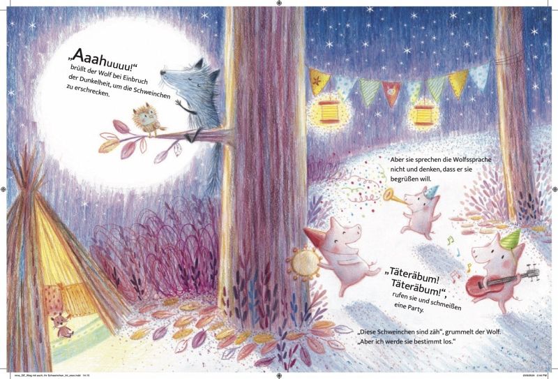 Der Wolf liebt die Ordnung und einen geregelten Tagesablauf. Doch eines Morgens ziehen nebenan drei lustige Schweinchen ein, die mit viel Lebensfreude und Energie allerlei Chaos veranstalten. Der Wolf versucht die Schweinchen zu vertreiben. Doch vergeblich, sie sind stur! Am Ende lässt sich der Wolf von ihrer Spontanität mitreißen und erkennt, dass das Leben auch mit ein bisschen Lärm und Unordnung schön sein kann."Aaahuuuu!", brüllt der Wolf bei Einbruch der Dunkelheit, um die Schweinchen zu erschrecken. Aber sie sprechen die Wolfssprache nicht und denken, dass er sie begrüßen will."Täteräbum!", rufen sie und schmeißen eine Party."Diese Schweinchen sind zäh", grummelt der Wolf. "Aber ich werde sie bestimmt los."- Über Kompromisse schließen und von anderen lernen - Über Toleranz und Akzeptanz- Sich von anderen Lebensweisen inspirieren lassenFür Kinder ab 3 Jahren