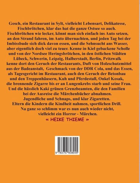Gosch, ein Restaurant in Sylt, vielleicht Lebensart, Delikatesse, Fischbrötchen, klar das hat die ganze Ostsee so auch. Fischbrötchen wie lecker, könnt man sich einfach ins Auto setzen, an den Strand fahren, im Auto übernachten, und jeden Tag bei der Imbissbude sich dick davon essen, und die Sehnsucht ans Wasser, aber eigentlich doch viel zu teuer. Kenne in Kiel gebackene Scholle und von der Nordsee Heringsbrötchen, in den östlichen Städten Lübeck, Schwerin, Leipzig, Halberstadt, Berlin, Pritzwalk kenne dort den Geruch der Restaurants, Duft von Holzschutzmittel aus der Badeanstalt, Geschmack von der DDR Cola, und das Essen, als Tagesgericht im Restaurant, auch den Geruch der Betonbau und den Treppenhäusern, Kuh und Pferdestall, Onkel Kosak, die brennende Zigarre bis er an Lungenkrebs starb und seine Frau. Und die hässlich Kaki grünen Grenzbeamten, die den Familien bei der Ausreise die Märchenbücher abnahmen. Jugendliche und Schnaps, und klar Zigaretten. Eltern die Kindern die Kindheit nahmen, sportlichen Drill. Na ganz so schlimm war es nun auch wieder nicht, vielleicht ein Horror - Märchen.