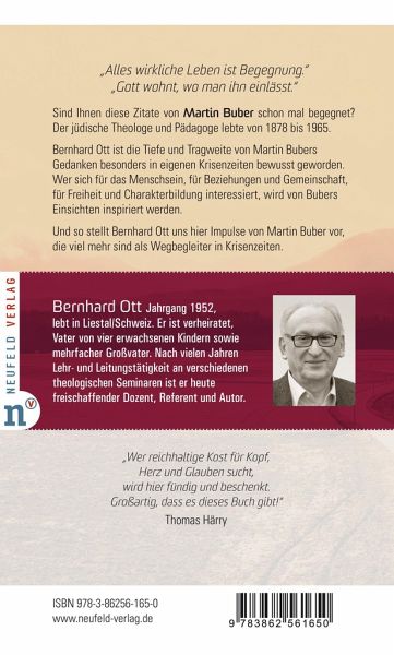 "Wer Tiefgang sucht, sollte Buber lesen. Dieser bärtige jüdische Gelehrte hat Christen mehr zu sagen, als viele ahnen. Doch wo beginnen? Bernhard Ott weiß Rat und macht uns mit einigen seiner großartigsten Texte bekannt. Das Ergebnis: ein überaus gehaltvolles Buber-Menü, von Ott kundig eingeführt, erklärt und auf unser heutiges Leben übertragen. Wer reichhaltige Kost für Kopf, Herz und Glauben sucht, wird hier fündig und beschenkt. Großartig, dass es dieses Buch gibt!" Thomas Härry