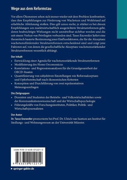 Vor allem Ökonomen sehen sich immer wieder mit dem Problem konfrontiert, dass ihre Empfehlungen zur Förderung von Wachstum und Wohlstand auf erhebliche Ablehnung stoßen. Tasso A. Enzweiler liefert eine theoretisch basierte Bestimmung jener Einflussfaktoren, die für die Akzeptanz wachstumsfördernder Strukturreformen entscheidend sind und zeigt auf, dass die Frage der gesellschaftlichen Akzeptanz wachstumsstärkender Strukturreformen interdisziplinär behandelt werden sollte.