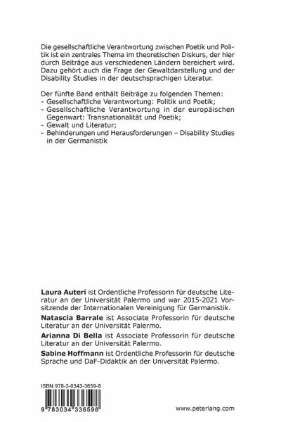 Die gesellschaftliche Verantwortung zwischen Poetik und Politik ist ein zentrales Thema im theoretischen Diskurs, der hier durch Beiträge aus verschiedenen Ländern bereichert wird. Dazu gehört auch die Frage der Gewaltdarstellung und der Disability Studies in der deutschsprachigen Literatur. Der fünfte Band enthält Beiträge zu folgenden Themen: - Gesellschaftliche Verantwortung: Politik und Poetik; - Gesellschaftliche Verantwortung in der europäischen Gegenwart: Transnationalität und Poetik; - Gewalt und Literatur; - Behinderungen und Herausforderungen - Disability Studies in der Germanistik