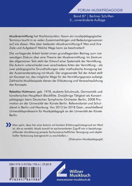Man spürt, dass hier eine Autorin mit breitem Erfahrungshintergrund am Werk ist, die es versteht, Musik sowohl im sachorientierten Zugriff wie in beziehungsstiftender Annäherung jenseits fachwissenschaftlicher Verengung und objekthafter Verkürzung laiengerecht zu erschließen. (Uve Urban, Diskussion Musikpädagogik, Nr. 49/2011)