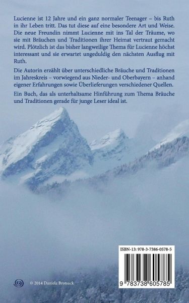 Lucienne ist 12 Jahre und ein ganz normaler Teenager - bis Ruth in ihr Leben tritt. Das tut diese auf eine besondere Art und Weise. Die neue Freundin nimmt Lucienne mit ins Tal der Träume, wo sie mit Bräuchen und Traditionen ihrer Heimat vertraut gemacht wird. Plötzlich ist das bisher langweilige Thema für Lucienne höchst interessant und sie erwartet ungeduldig den nächsten Ausflug mit Ruth.Die Autorin erzählt über unterschiedliche Bräuche und Traditionen im Jahreskreis - vorwiegend aus Nieder- und Oberbayern - anhand eigener Erfahrungen sowie Überlieferungen verschiedener Quellen.Ein Buch, das als unterhaltsame Hinführung zum Thema Bräuche und Traditionen gerade für junge Leser ideal ist.