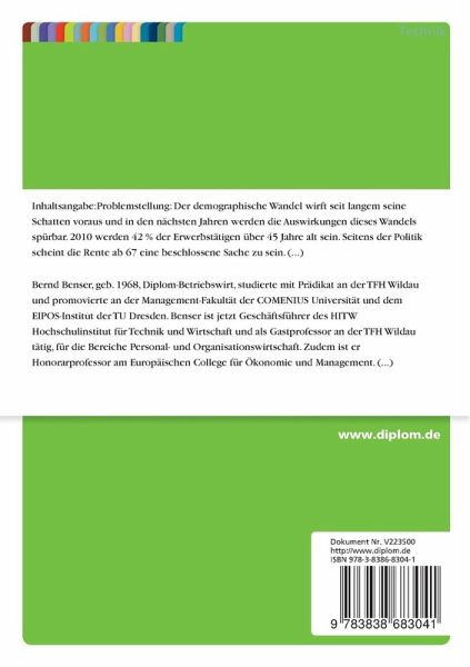 Der demographische Wandel wirft seit langem seine Schatten voraus und in den nächsten Jahren werden die Auswirkungen dieses Wandels spürbar. 2010 werden 42 % der Erwerbstätigen über 45 Jahre alt sein. Seitens der Politik scheint die Rente ab 67 eine beschlossene Sache zu sein. Wie sollen dann die 17! langen Berufsjahre ab 50 gestaltet werden?
