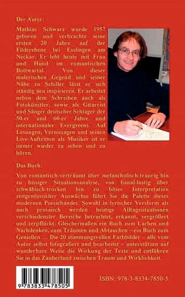 Von heimatverbunden bis zeitkritisch, von romantisch bis tiefgründig-traurig, von bissig-böse bis humorvoll-schwäbisch reicht die Palette dieses Poesiebandes. Sowohl in lyrischer als auch in prosaischer Form entführt Sie dieses Werk in die Zauberwelt der Dichtung. Das Arbeitsleben wird genauso kritisch betrachtet wie das Vereinsleben, die Schönheit dieser Erde findet genauso ihre Beachtung wie die tiefversteckten Schatten der menschlichen Seele, die gesellschaftlichen Entwicklungen heutzutage werden ebenso beleuchtet wie die Wünsche und Träume des Einzelnen. "Wege ins Herz" ist ein Buch zum Träumen, ein Buch für nachdenkliche Momente und - selbstverständlich - eine Aufforderung zum Lachen über sich und andere, und somit ein Buch für Herz und Gemüt. Lassen Sie sich entführen in die Zauberwelt der modernen, leicht verständlichen Poesie und genießen Sie Ihren Aufenthalt dort so lange und intensiv wie nur möglich. Bereiten Sie sich selber immer wieder schöne Momente - tauchen Sie einin die unendliche Tiefe der Romantik, in das Meer der Freude und Zufriedenheit und erleben Sie den Vulkanausbruch äußerst kritischer Sozialbetrachtung. Verzichten Sie nicht auf diesen Querschnitt moderner Dichtung und erleben Sie wieder einmal die Ausdrucksstärke der deutschen Sprache im Zusammenspiel mit den 20 stimmungsvollen Farbfotografien, vom Autor selbst erstellt und bearbeitet. "Wege ins Herz" - ein Begleiter für aufgeschlossene, moderne Menschen.