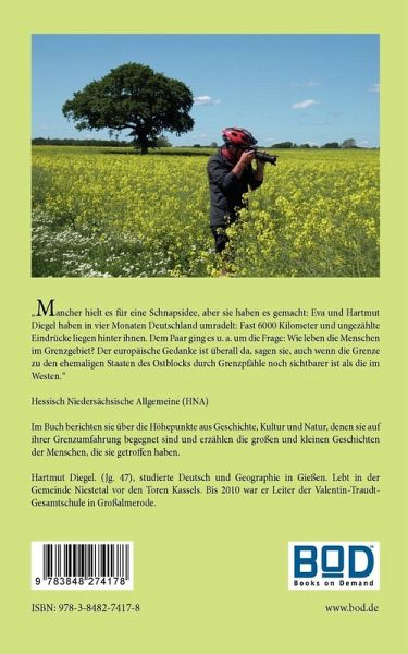 \\\\\\\\\\\\\\\\\\\\\\\\\\\\\\\"Mancher hielt es für eine Schnapsidee, aber sie haben es gemacht: Eva und Hartmut Diegel haben in vier Monaten Deutschland umradelt: Fast 6000 Kilometer und ungezählte Eindrücke liegen hinter ihnen. Dem Paar ging es u. a. um die Frage: Wie leben die Menschen im Grenzgebiet? ?Der europäische Gedanke ist überall da?, sagen sie, auch wenn die Grenze zu den ehemaligen Staaten des Ostblocks durch Grenzpfähle noch sichtbarer ist als die im Westen.\\\\\\\\\\\\\\\\\\\\\\\\\\\\\\\" Hessisch Niedersächsische Allgemeine (HNA) Im Buch berichten sie über die Höhepunkte aus Geschichte, Kultur und Natur, denen sie auf ihrer Grenzumfahrung begegnet sind und erzählen die großen und kleinen Geschichten der Menschen, die sie getroffen haben. Hartmut Diegel. (Jg. 47), studierte Deutsch und Geographie in Gießen. Bis 2010 war er Leiter der Valentin-Traudt-Gesamtschule in Großalmerode.