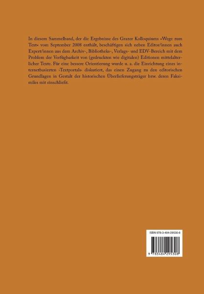 Dieser Sammelband enthält 19 Beiträge von 21 Autor/innen, die sich im Rahmen des interdisziplinären Kolloquiums "Wege zum Text" Mitte September 2008 in Graz zusammenfanden, um das Problem der Verfügbarkeit von Editionen mittelalterlicher deutschsprachiger Texte für Wissenschaft und Lehre zu beleuchten und neue Strategien für einen möglichst 'barrierefreien' Textzugang zu finden. Zur Teilnahme an dieser sehr zielorientierten Veranstaltung waren sowohl führende fachwissenschaftliche Editor/innen eingeladen als auch namhafte Vertreter/innen aus dem Archiv , Bibliotheks- und Verlagswesen sowie Spezialist/innen für Fragen zum Urheberrecht und zu modernen Informations- und Editionstechnologien. Gemeinsam wurde zum einen eine Bestandsaufnahme von bereits laufenden Initiativen für einen möglichst optimalen Zugriff auf gedruckte und elektronische Textdarbietungen geleistet, wobei der Blick auch auf die historischen Überlieferungsträger bzw. deren Digitalisate gerichtet war, und zum anderen diskutierte man ausblickhaft die Einrichtung eines internetbasierten 'Textportals' zur Vernetzung aller verfügbaren Textressourcen mitsamt den daran geknüpften Metainformationen rund um die Entstehung und Weiterentwicklung von Editionen.