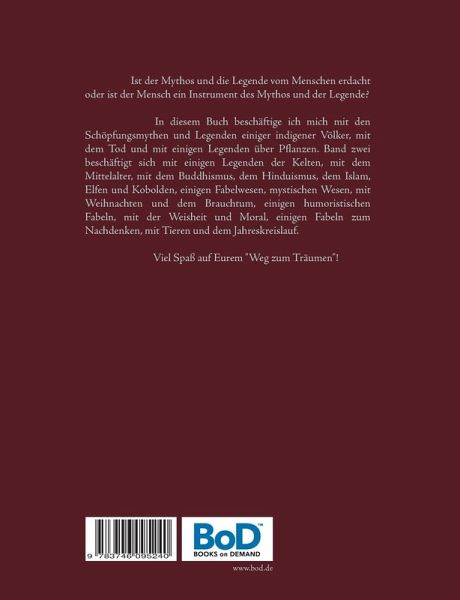 Ist der Mythos und die Legende vom Menschen erdacht oder ist der Mensch ein Instrument des Mythos und der Legende?In diesem Buch beschäftige ich mich mit den Schöpfungsmythen und Legenden einiger indigener Völker, mit dem Tod und mit einigen Legenden über Pflanzen. Band zwei beschäftigt sich mit einigen Legenden der Kelten, mit dem Mittelalter, mit dem Buddhismus, dem Hinduismus, dem Islam, Elfen und Kobolden, einigen Fabelwesen, mystischen Wesen, mit Weihnachten und dem Brauchtum, einigen humoristischen Fabeln, mit der Weisheit und Moral, einigen Fabeln zum Nachdenken, mit Tieren und dem Jahreskreislauf.Viel Spaß auf Eurem "Weg zum Träumen"!