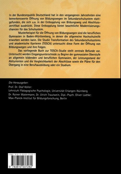Die TOSCA-Studie beschreibt die Zusammensetzung der Schülerschaft an allgemeinbildenden und beruflichen Gymnasien in Baden-Württemberg, analysiert die Vergleichbarkeit der Abschlüsse und untersucht die Überleitung in eine Berufsausbildung oder ein Universitätsstudium. Die beruflichen Gymnasien Baden-Württembergs bieten einer traditionell eher gymnasialfernen Schülerschaft die Möglichkeit, mit einer berufsbezogenen fachlichen Schwerpunktsetzung das Abitur zu machen. Das Buch mit Ergebnissen aus der Studie Transformation des Sekundarschulsystems und akademische Karrieren (TOSCA) untersucht diese Form der Öffnung von Bildungswegen vor allem im Hinblick auf die Studierfähigkeit. TOSCA analysiert Eingangsunterschiede zu Beginn der gymnasialen Oberstufe an allgemeinbildenden und beruflichen Gymnasien, die Vergleichbarkeit der Abschlüsse und die erfolgreiche Überleitung in eine Berufsausbildung oder ein Universitätsstudium.