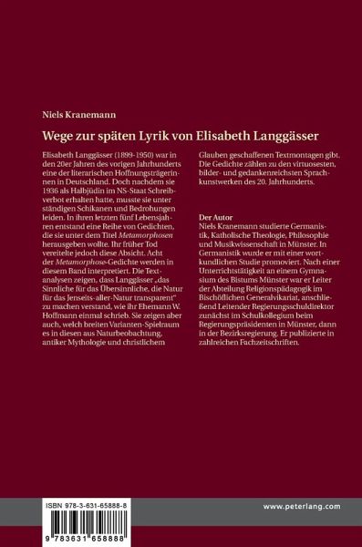 Elisabeth Langgässer (1899-1950) war in den 20er Jahren des vorigen Jahrhunderts eine der literarischen Hoffnungsträgerinnen in Deutschland. Doch nachdem sie 1936 als Halbjüdin im NS-Staat Schreibverbot erhalten hatte, musste sie unter ständigen Schikanen und Bedrohungen leiden. In ihren letzten fünf Lebensjahren entstand eine Reihe von Gedichten, die sie unter dem Titel Metamorphosen herausgeben wollte. Ihr früher Tod vereitelte jedoch diese Absicht. Acht der Metamorphose-Gedichte werden in diesem Band interpretiert. Die Textanalysen zeigen, dass Langgässer «das Sinnliche für das Übersinnliche, die Natur für das Jenseits-aller-Natur transparent» zu machen verstand, wie ihr Ehemann W. Hoffmann einmal schrieb. Sie zeigen aber auch, welch breiten Varianten-Spielraum es in diesen aus Naturbeobachtung, antiker Mythologie und christlichem Glauben geschaffenen Textmontagen gibt. Die Gedichte zählen zu den virtuosesten, bilder- und gedankenreichsten Sprachkunstwerken des 20. Jahrhunderts