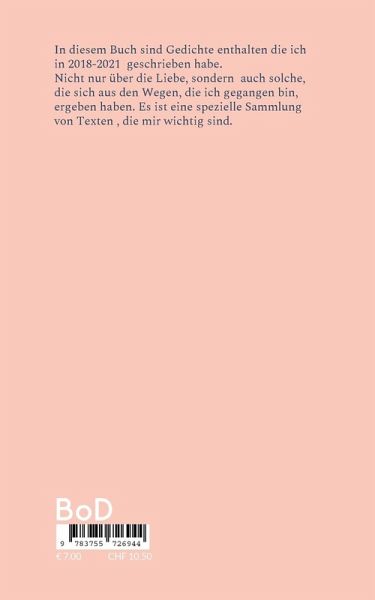 In diesem Buch sind Gedichte enthalten die ich in 2018-2021 geschrieben habe. Nicht nur über die Liebe, sondern auch solche, die sich aus den Wegen, die ich gegangen bin, ergeben haben. Es ist eine spezielle Sammlung von Texten , die mir wichtig sind.