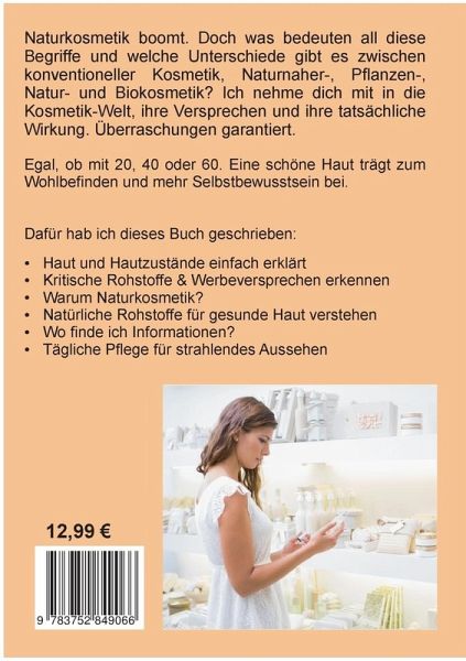 Wegweiser durch den Kosmetik-Dschungel!Pflanzenkosmetik, vegane Kosmetik und Naturkosmetik boomen. Was bedeuten diese Begriffe und welche Unterschiede gibt es zwischen konventioneller Kosmetik, Naturnaher-, Pflanzen-, Natur- und Biokosmetik? Immer häufiger lesen wir über kritische Inhaltstoffe in Kosmetika. Was verbirgt sich dahinter? Ich nehme dich mit in den Kosmetik-Dschungel, seine Versprechen und seine tatsächliche Wirkung. Überraschungen garantiert. Egal, ob mit 20, 40 oder 60. Eine schöne Haut trägt zum Wohlbefinden und mehr Selbstbewusstsein bei. Gehörst du zu den Personen, die sich gern pflegen und die eigene Schönheit unterstreichen wollen? Ohne dabei deine Gesundheit oder die Umwelt zu schädigen? Sind natürliche Rohstoffe und ein schonender Umgang mit den Ressourcen der Welt bedeutend für dich? Dafür hab ich dieses Buch geschrieben:Haut und Hautzustände einfach erklärtKritische Rohstoffe & Werbeversprechen erkennenWarum Naturkosmetik?Natürliche Rohstoffe für gesunde Haut verstehenInformationen findenTägliche Pflege für strahlendes AussehenMit dem richtigen Wissen und abgestimmten Produkten für deine Haut macht es wieder Spaß Kosmetik einzukaufen.