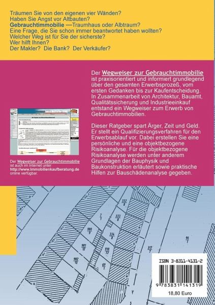Träumen Sie von den eigenen vier Wänden? Haben Sie Angst vor Altbauten? Gebrauchtimmobilie - Traumhaus oder Albtraum? Eine Frage, die Sie schon immer beantwortet haben wollten? Welcher Weg ist für Sie der sicherste? Wer hilft Ihnen? Der Makler? Die Bank? Der Verkäufer? Der Wegweiser zur Gebrauchtimmobilie ist praxisorientiert und informiert grundlegend über den gesamten Erwerbsprozess vom ersten Gedanken bis zur Kaufentscheidung. In Zusammenarbeit von Architektur, Bauamt, Qualitätssicherung und Industrieeinkauf entstand ein Wegweiser zum Erwerb von Gebrauchtimmobilien. Dieser Ratgeber spart Ärger, Zeit und Geld. Er stellt ein Qualifizierungsverfahren für den Erwerbsablauf vor. Dabei erstellen Sie eine persönliche und eine objektbezogene Risikoanalyse. Für die objektbezogene Risikoanalyse werden unter anderem Grundlagen der Bauphysik und Baukonstruktion erläutert sowie praktische Hilfen zur Bauschädenanalyse gegeben.