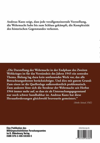 Andreas Kunz greift die Forderung nach einer"Geschichte der Gesellschaft im Krieg" auf und stellt sich der Herausforderung einer Strukturgeschichte der bewaffneten Macht in der Zeit des militärischen, staatlichen und gesellschaftlichen Zusammenbruchs 1944/45. Im Ergebnis zeigt die Untersuchung, dass jede verallgemeinernde Vorstellung, die Wehrmacht habe bis zum Schluss gekämpft, die Komplexität des historischen Gegenstandes verkennt, die sich hinter der Fassade eines vermeintlich konsistenten und zuverlässigen militärischen Instruments verbirgt.