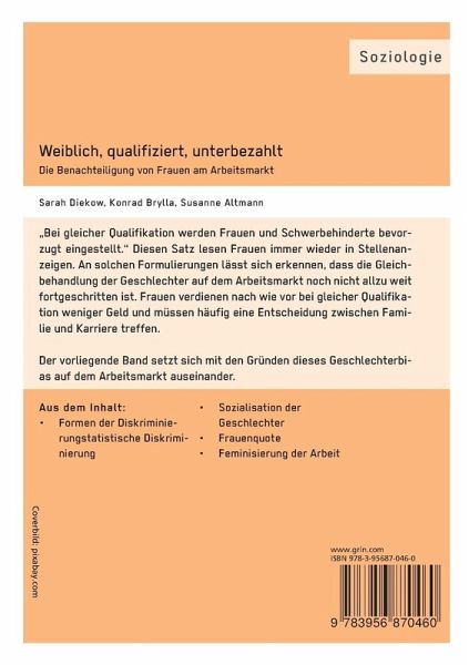 Fachbuch aus dem Jahr 2013 im Fachbereich Soziologie - Familie, Frauen, Männer, Sexualität, Geschlechter, , Sprache: Deutsch, Abstract: "Bei gleicher Qualifikation werden Frauen und Schwerbehinderte bevorzugt eingestellt." Diesen Satz lesen Frauen immer wieder in Stellenanzeigen. An solchen Formulierungen lässt sich erkennen, dass die Gleichbehandlung der Geschlechter auf dem Arbeitsmarkt noch nicht allzu weit fortgeschritten ist. Frauen verdienen nach wie vor bei gleicher Qualifikation weniger Geld und müssen häufig eine Entscheidung zwischen Familie und Karriere treffen.Der vorliegende Band setzt sich mit den Gründen dieses Geschlechterbias auf dem Arbeitsmarkt auseinander.Aus dem Inhalt: Formen der Diskriminierung, statistische Diskriminierung, Sozialisation der Geschlechter, Frauenquote, Feminisierung der Arbeit.