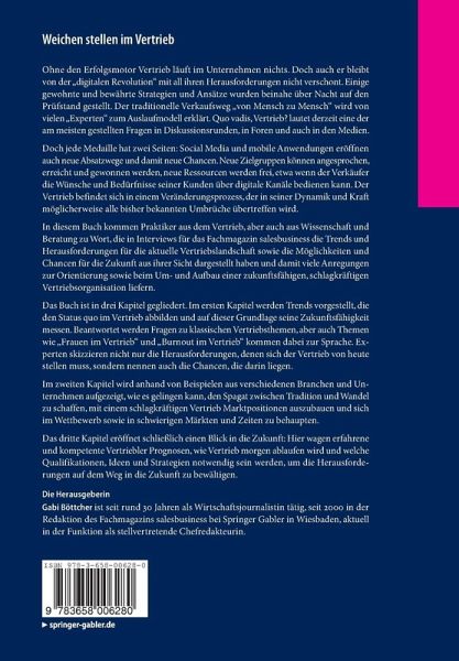 In diesem Buch kommen Praktiker aus dem Vertrieb, aber auch aus Wissenschaft und Beratung zu Wort, die in Interviews für das Fachmagazin salesbusiness die Trends und Herausforderungen für die aktuelle Vertriebslandschaft sowie die Möglichkeiten und Chancen für die Zukunft aus ihrer Sicht dargestellt haben und damit viele Anregungen zur Orientierung sowie beim Um- und Aufbau einer zukunftsfähigen, schlagkräftigen Vertriebsorganisation liefern.