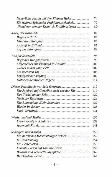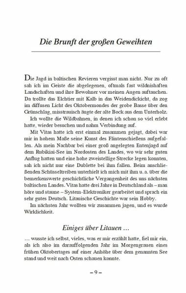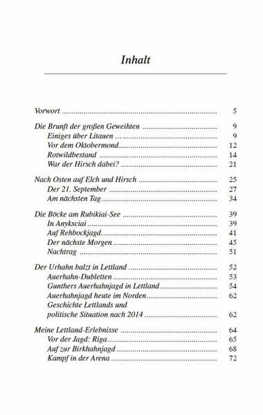 In seinem neuesten Werk beschreibt der leidenschaftliche Jäger und erfolgreiche Jagdbuchautor,warum gerade die Länder des Baltikums einen besonderen Reiz auf ihn ausüben: Ausgedehnte Mischwälder sowie unzählige idyllische Binnenlandseen oder Flüsse sind malerische Kulisse für seine packenden Erlebnisse auf der Fährte des Elches oder bei der Jagd auf Damwild und Braunbär.Gerhard Böttger erzählt mitreißend von der faszinierenden Auer- und Birkhahnbalz in einsamen und verwunschenen Moorlandschaften, von der Brunft der großen Geweihten, von der Jagd auf Muffel in Tschechien oder auf Kronenhirsche und kapitale Schaufler in Bulgarien. Doch auch dem heimischen Weidwerk in seiner bunten Fülle, das ihn erfüllt und geprägt hat, widmet sich der Autor. Seine Auseinandersetzung mit historischen und gesellschaftlichen Hintergründen machen seine Erzählungen zu etwas Besonderem.
