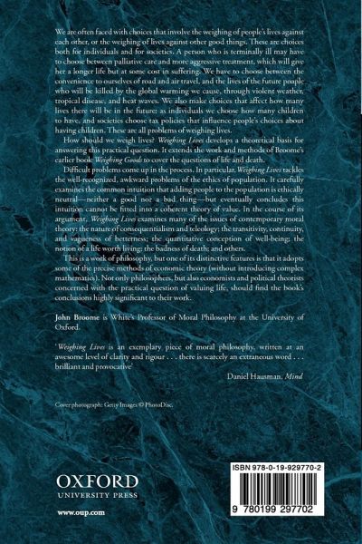 How should we weigh lives? Weighing Lives develops a theoretical basis for answering this practical question. It extends the work and methods of Broome's earlier book Weighing Goods to cover the questions of life and death.