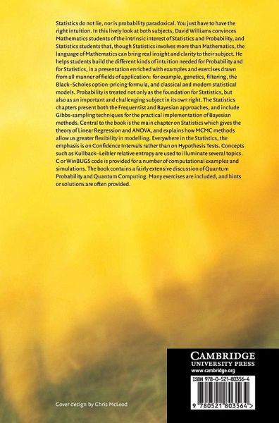Statistics do not lie, nor is probability paradoxical. You just have to have the right intuition. In this lively look at both subjects, David Williams convinces mathematics students of the intrinsic interest of statistics and probability, and statistics students that the language of mathematics can bring real insight and clarity to their subject. He helps students build the intuition needed, in a presentation enriched with examples drawn from all manner of applications, e.g., genetics, filtering, the Black-Scholes option-pricing formula, quantum probability and computing, and classical and modern statistical models. Statistics chapters present both the Frequentist and Bayesian approaches, emphasising Confidence Intervals rather than Hypothesis Test, and include Gibbs-sampling techniques for the practical implementation of Bayesian methods. A central chapter gives the theory of Linear Regression and ANOVA, and explains how MCMC methods allow greater flexibility in modelling. C or WinBUGS code is provided for computational examples and simulations. Many exercises are included; hints or solutions are often provided.