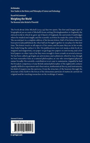 The book about John Michell (1724-93) has two parts. The first and longest part is biographical, an account of Michell's home setting (Nottinghamshire in England), the clerical world in which he grew up (Church of England), the university (Cambridge) where he studied and taught, and the scientific activities he made the center of his life. The second part is a complete edition of his known letters. Half of his letters have not been previously published; the other half are brought together in one place for the first time. The letters touch on all aspects of his career, and because they are in his words, they help bring the subject to life. His publications were not many, a slim book on magnets and magnetism, one paper on geology, two papers on astronomy, and a few brief papers on other topics, but they were enough to leave a mark on several sciences. He has been called a geologist, an astronomer, and a physicist, which he was, though we best remember him as a natural philosopher, as one who investigated physical nature broadly. His scientific contribution is not easy to summarize. Arguably he had the broadest competence of any British natural philosopher of the eighteenth century: equally skilled in experiment and observation, mathematical theory, and instruments, his field of inquiry was the universe. From the structure of the heavens through the structure of the Earth to the forces of the elementary particles of matter, he carried out original and far-reaching researches on the workings of nature.