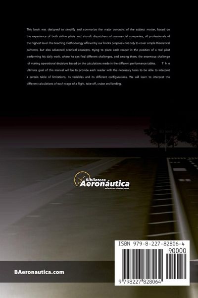 This book was designed to simplify and summarize the major concepts of the subject matter, based on the experience of both airline pilots and aircraft dispatchers of commercial companies, all professionals of the highest level. The teaching methodology offered by our books proposes not only to cover simple theoretical contents, but also advanced practical concepts, trying to place each reader in the position of a real pilot performing his daily work, where he can find different challenges, and among them, the enormous challenge of making operational decisions based on the calculations made in the different performance tables. The ultimate goal of this manual will be to provide each reader with the necessary tools to be able to interpret a certain table of limitations, its variables and its different configurations. We will learn to interpret the different calculations of each stage of a flight, take-off, cruise and landing.