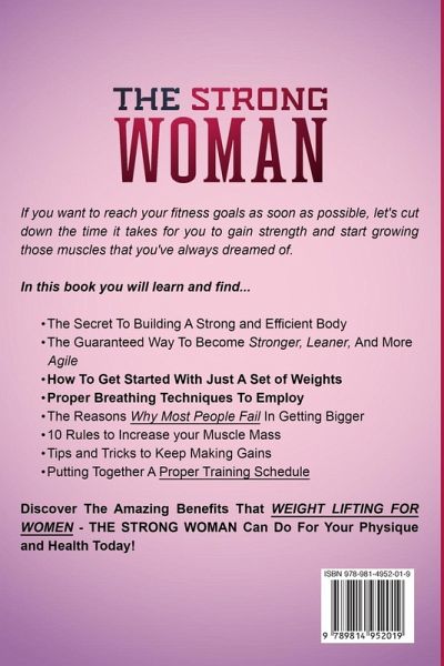 Discover The Amazing Benefits That WEIGHT LIFTING FOR WOMEN - THE STRONG WOMAN Can Do For Your Physique and Health Today! If you want to reach your fitness goals as soon as possible, let's cut down the time it takes for you to gain strength and start growing those muscles that you've always dreamed of. In this book you will learn and find...The Secret To Building A Strong and Efficient Body The Guaranteed Way To Become Stronger, Leaner, And More Agile How To Get Started With Just A Set of Weights Proper Breathing Techniques To Employ The Reasons Why Most People Fail In Getting Bigger 10 Rules to Increase your Muscle Mass Tips and Tricks to Keep Making Gains Putting Together A Proper Training Schedule BONUSHow Muscle is Really Built How To Work On Each Targeted Muscle Group Effectively How To Pick The Right Number of Repetitions Focusing On Bodyweight Workouts To Improve Results The Correct Way To Perform Workouts That Targets The Upper Body, Lower Body, Core, and Legs How Your Diet Affects The Quality of Your Workouts And so much more... Don't let yourself get complacent! Stop Dreaming and Start Working Towards The Body You've Always Wanted! Pick up your copy right now by clicking the BUY NOW button at the top of this page! To Your Success!