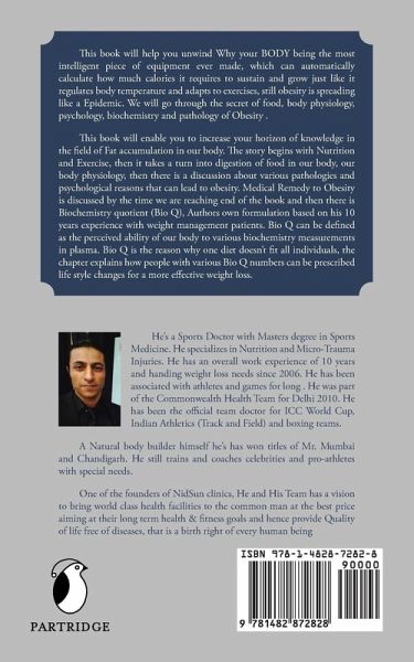 This book will help you unwind Why your BODY being the most intelligent piece of equipment ever made, which can automatically calculate how much calories it requires to sustain and grow just like it regulates body temperature and adapts to exercises, still obesity is spreading like a Epidemic. We will go through the secret of food, body physiology, psychology, biochemistry and pathology of Obesity . This book will enable you to increase your horizon of knowledge in the field of Fat accumulation in our body. The story begins with Nutrition and Exercise, then it takes a turn into digestion of food in our body, our body physiology, then there is a discussion about various pathologies and psychological reasons that can lead to obesity. Medical Remedy to Obesity is discussed by the time we are reaching end of the book and then there is Biochemistry quotient (Bio Q), Authors own formulation based on his 10 years experience with weight management patients. Bio Q can be defined as the perceived ability of our body to various biochemistry measurements in plasma. Bio Q is the reason why one diet doesn't fit all individuals, the chapter explains how people with various Bio Q numbers can be prescribed life style changes for a more effective weight loss.