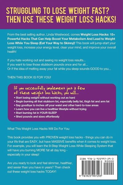 Struggling to Lose Weight FAST? Then Use These Weight Loss HACKS! From the best selling author, Linda Westwood, comes Weight Loss Hacks: 15+ Powerful Hacks That Can Help Boost Your Metabolism And Lead to Weight Loss While You Sleep (Eat Your Way to Skinny)! This book will jump-start your weight loss, increase your energy level, clear your mind, and improve your overall health! If you hate working out and seeing no weight loss results... If you want to lose those stubborn pounds once and for all... Or if the idea of melting away your fat while you sleep sounds GOOD to you... THEN THIS BOOK IS FOR YOU! What This Weight Loss Hacks Will Do For You This book provides you with PROVEN weight loss hacks - things you can do in your life that are EASY, but have MASSIVE benefits when it comes to weight loss. For example, you will learn the 9-Step Weight Loss While Sleeping System that will have you burning MORE fat all day long - especially in your sleep! Are you ready to look and feel slimmer, healthier, and sexier than you have in years? Then check out these weight loss hacks TODAY! If you successfully implement just a few of these weight loss hacks, you will… Start losing weight without working out as hard Begin burning all that stubborn fat, especially belly fat, thigh fat and arm fat Say goodbye to inches off your waist and other hard-to-lose areas Learn how you can live a healthier lifestyle without trying Start burning fat in YOUR SLEEP• Shed pounds and sizes effortlessly
