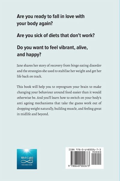 Are you ready to fall in love with your body again? Are you sick of diets that don’t work? Do you want to feel vibrant, alive, and happy? Jane shares her story of recovery from binge eating disorder and the strategies she used to stabilise her weight and get her life back on track. This book will help you to reprogram your brain to make changing your behaviour around food easier than it would otherwise be. And you’ll learn how to switch on your body’s anti ageing mechanisms that take the guess work out of dropping weight naturally, building muscle, and feeling great in midlife and beyond.