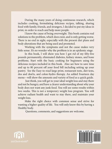 During the many years of doing continuous research, which includes cooking, formulating delicious recipes, talking, sharing food with family, friends, and strangers, I decided to put my ideas in print, in order to reach and help more people. I know the cause of being overweight. This book contains real solutions to the problem, which does exist, and is only getting worse. There is no end in sight, especially with the present diet plans and body alterations that are being used and promoted. Working with the symptoms and not the cause makes very little sense. It's no wonder why the problem is in an epidemic stage. In this book, I will show you how I got rid of my fifty-five pounds permanently, eliminated diabetes, kidney stones, and bone problems. Start with the basic cooking for beginners using the delicious recipes included in this book. Also see how to save time and up to 80 percent off your food bill including setting up your pantry. See the Easy-to-read large print, restaurant tests, diet tests, dos and don'ts, and colon-hydro therapy. An added Fourteen day menu-will show the amounts and variety of food as a quick guide. Just think, you will get to your ideal weight loss and stay there and not be hungry, and have a clearer understanding about why your body does not want any junk food. You will see some results within two weeks. This is not a temporary weight loss program. You will achieve radiant health and want to stay there, and maintain your weight loss. Make the right choice with common sense and strive for wanting a higher quality of life. You will only know this by having a Healthy body. Questions, comments, and suggestions are welcome.
