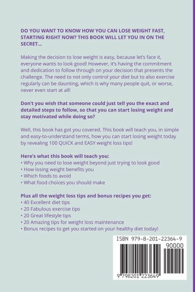 DO YOU WANT TO KNOW HOW YOU CAN LOSE WEIGHT FAST, STARTING RIGHT NOW? THIS BOOK WILL LET YOU IN ON THE SECRET... Making the decision to lose weight is easy, because let's face it, everyone wants to look good! However, it's having the commitment and dedication to follow through on your decision that presents the challenge. The need to not only control your diet but to also exercise regularly can be daunting, which is why many people quit, or worse, never even start at all! Don't you wish that someone could just tell you the exact and detailed steps to follow, so that you can start losing weight and stay motivated while doing so? Well, this book has got you covered. This book will teach you, in simple and easy-to-understand terms, how you can start losing weight today by revealing 100 QUICK and EASY weight loss tips! All of these tips are specifically aimed to help you throughout your weight loss journey, from when you are getting started up until you've lost those extra pounds and are looking to maintain your ideal weight. Here's what this book will teach you:Why you need to lose weight beyond just trying to look good How losing weight benefits you Which foods to avoid What food choices you should make Plus all the weight loss tips and bonus recipes you get:40 Excellent diet tips 20 Fabulous exercise tips 20 Great lifestyle tips 20 Amazing tips for weight loss maintenance Bonus recipes to get you started on your healthy diet today! You will never be able to get a tip list as comprehensive as this one anywhere else. Knowing and following all the tips in this book will surely get you on your way to reaching your weight loss goals!