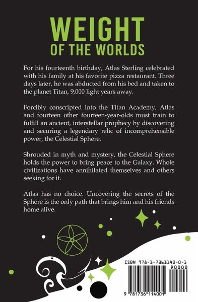 For his fourteenth birthday, Atlas Sterling celebrated with his family at his favorite pizza restaurant. Three days later, he was abducted from his bed and taken to the planet Titan, 9,000 light years away. Forcibly conscripted into the Titan Academy, Atlas and fourteen other fourteen-year-olds must train to fulfill an ancient, interstellar prophecy by discovering and securing a legendary relic of incomprehensible power, the Celestial Sphere. Shrouded in myth and mystery, the Celestial Sphere holds the power to bring peace to the Galaxy. Whole civilizations have annihilated themselves and others seeking for it. Atlas has no choice. Uncovering the secrets of the Sphere is the only path that brings him and his friends home alive.