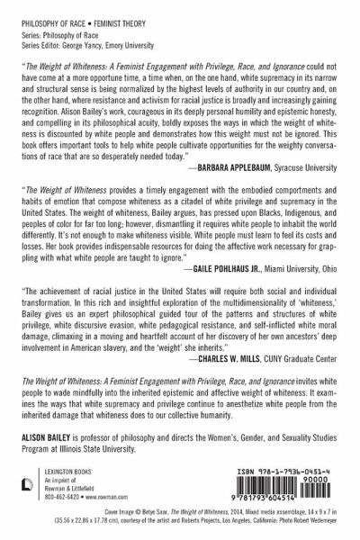 "Check your privilege" is not a request for a simple favor. It asks white people to consider the painful dimensions of what they have been socialized to ignore. Alison Bailey’s The Weight of Whiteness: A Feminist Engagement with Privilege, Race, and Ignorance examines how whiteness misshapes our humanity, measuring the weight of whiteness in terms of its costs and losses to collective humanity. People of color feel the weight of whiteness daily. The resistant habits of whiteness and its attendant privileges, however, make it difficult for white people to feel the damage. White people are more comfortable thinking about white supremacy in terms of what privilege does for them, rather than feeling what it does to them. The first half of the book focuses on the overexposed side of white privilege, the side that works to make the invisible and intangible structures of power more visible and tangible. Bailey discusses the importance of understanding privileges intersectionally, the ignorance-preserving habits of "white talk," and how privilege and ignorance circulate in educational settings. The second part invites white readers to explore the underexposed side of white dominance, the weightless side that they would rather not feel. The final chapters are powerfully autobiographical. Bailey engages readers with a deeply personal account of what it means to hold space with the painful weight of whiteness in her own life. She also offers a moving account of medicinal genealogies, which helps to engage the weight she inherits from her settler colonial ancestors. The book illustrates how the gravitational pull of white ignorance and comfort are stronger than the clean pain required for collective liberation. The stakes are high: Failure to hold the weight of whiteness ensures that white people will continue to blow the weight of historical trauma through communities of color.