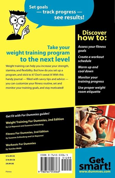 Set goals -- track progress see results! Take your weight training program to the next level Weight training can help you increase your strength, stamina, and flexibility. But how do you set up a program, and stick to it? Don't sweat it! With this handy journal -- filled with savvy tips and advice -- you can customize your fitness routine, set and monitor your training goals, and stay motivated! Get fit with For Dummies guides! Weight Training For Dummies, 2nd Edition by Liz Neporent and Suzanne Schlosberg Fitness For Dummies, 2nd Edition by Suzanne Schlosberg and Liz Neporent Workouts For Dummies by Tamilee webb Discover how to: Assess your fitness goals Create a workout schedule Warm up and cool down Monitor your training progress Use proper weight room etiquette
