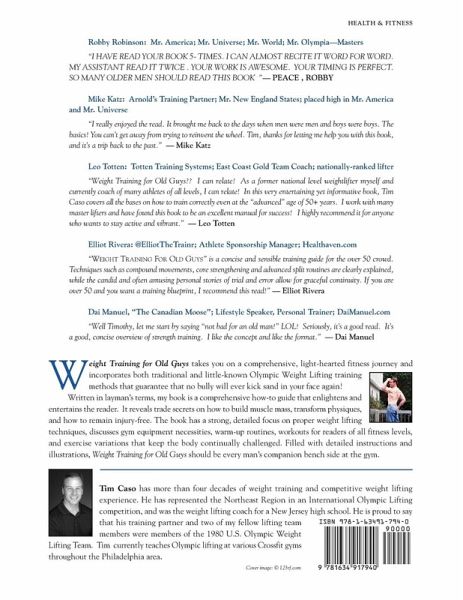 Weight Training for Old Guys takes you on a comprehensive, light-hearted fitness journey and incorporates both traditional and little-known Olympic Weight Lifting training methods that guarantee that no bully will ever kick sand in your face again! Written in layman's terms, Weight Training for Old Guys is a comprehensive how-to guide that enlightens and entertains the reader. It reveals trade secrets on how to build muscle mass, transform physiques, and how to remain injury-free. The book has a strong, detailed focus on proper weight lifting techniques, discusses gym equipment necessities, warm-up routines, workouts for readers of all fitness levels, and exercise variations that keep the body continually challenged. Filled with detailed instructions and illustrations, Weight Training for Old Guys should be every man's companion bench side at the gym.