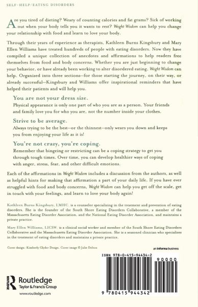 Kathleen Burns Kingsbury is a licensed mental health counselor specializing in the treatment and prevention of eating disorders. She is founder of the South Shore Eating Disorders Collaborative in Quincy and Easton, Massachusetts. Mary Ellen Williams is a licensed independent social worker in North Easton, Massachusetts. She is a seasoned clinician whose specialty includes individual and group treatment of eating disorders.