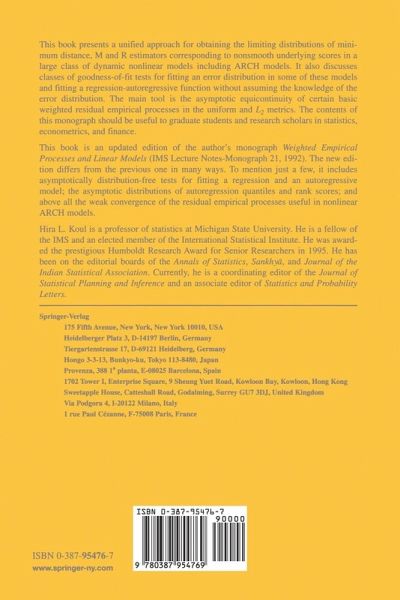 This book presents a unified approach for obtaining the limiting distributions of minimum distance, M and R estimators corresponding to non-smooth underlying scores in a large class of dynamic non-linear models including ARCH models. It also discusses classes of goodness-of-t tests for fitting an error distribution in some of these models and/or fitting a regression-autoregressive function without assuming the knowledge of the error distribution. The main tool is the asymptotic equicontinuity of certain basic weighted residual empirical processes in the uniform and L2 metrics. The contents of this monograph should be useful to graduate students and research scholars in statistics, econometrics, and finance. This book is a an updated edition of the author's monograph "Weighted Empirical Processes and Linear Models" (IMS Lecture Notes-Monograph 21, 1992). The new edition differs from the previous one in many ways. To mention just a few: It includes asymptotically distribution free tests for fitting a regression and/or an autoregressive models; the asymptotic distributions of auto-regression quantiles and rank scores; and above all the weak convergence of the residual empirical processes useful in nonlinear ARCH models. Hira L. Koul is a professor of statistics at Michigan State University. He is a Fellow of the IMS and an Elected Member of the International Statistical Institute. He was awarded the prestigious Humboldt Research Award for Senior Researchers in 1995. He has been on the editorial boards of the Annals of Statistics, Sankhya, and J. Indian Statistical Association. Currently he is a Coordinating Editor of the Journal of Statistical Planning and Inference, and an Associate Editor of Statistics and Probability Letters.