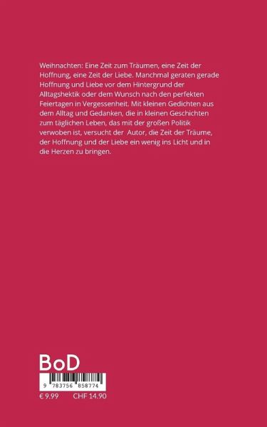 Weihnachten: Eine Zeit zum Träumen, eine Zeit der Hoffnung, eine Zeit der Liebe. Manchmal geraten gerade Hoffnung und Liebe vor dem Hintergrund der Alltagshektik oder dem Wunsch nach den perfekten Feiertagen in Vergessenheit. Mit kleinen Gedichten aus dem Alltag und Gedanken, die in kleinen Geschichten zum täglichen Leben, das mit der großen Politik verwoben ist, versucht der Autor, die Zeit der Träume, der Hoffnung und der Liebe ein wenig ins Licht und in die Herzen zu bringen.